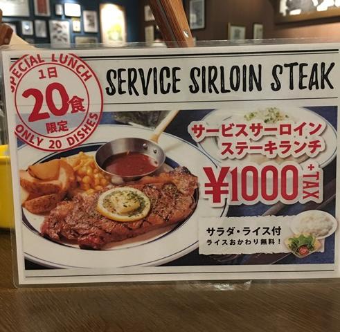 サービスサーロインステーキランチ1,000円をいただきました。1日限定s20食だそうで、早めに行ったので注文できました。しかし、期待値が高かったせいか、値段を考えたら、まぁこんなものかな、という位のランチでした。悪くはないですが、リピはないかな。