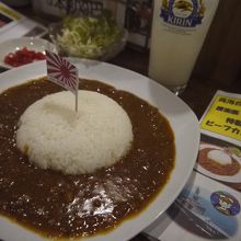 3種の牛肉を使い、長く煮込んでいて、牛肉がルーの中に繊維状に完全に崩れているのが特徴。欧風カレーっぽくも、キーマカレーっぽくも感じる。トマトピューレで酸味、玉ネギで甘みを出している。
