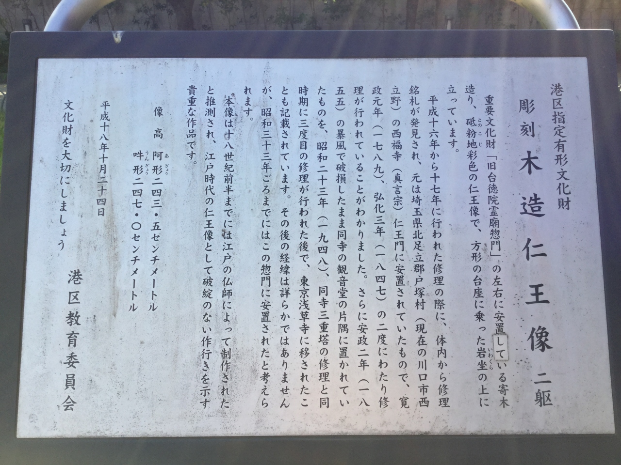 東京港区、増上寺のお隣にある台徳院霊廟惣門の正面で両側からぐっとにらみを利かせた二対の木造仁王像は門側に港区教育委員会が書かれた案内板を見ると大変歴史があるのはもとより、修理や移築の経緯も読み取れます。東京の歴史を見てきた仁王像です。