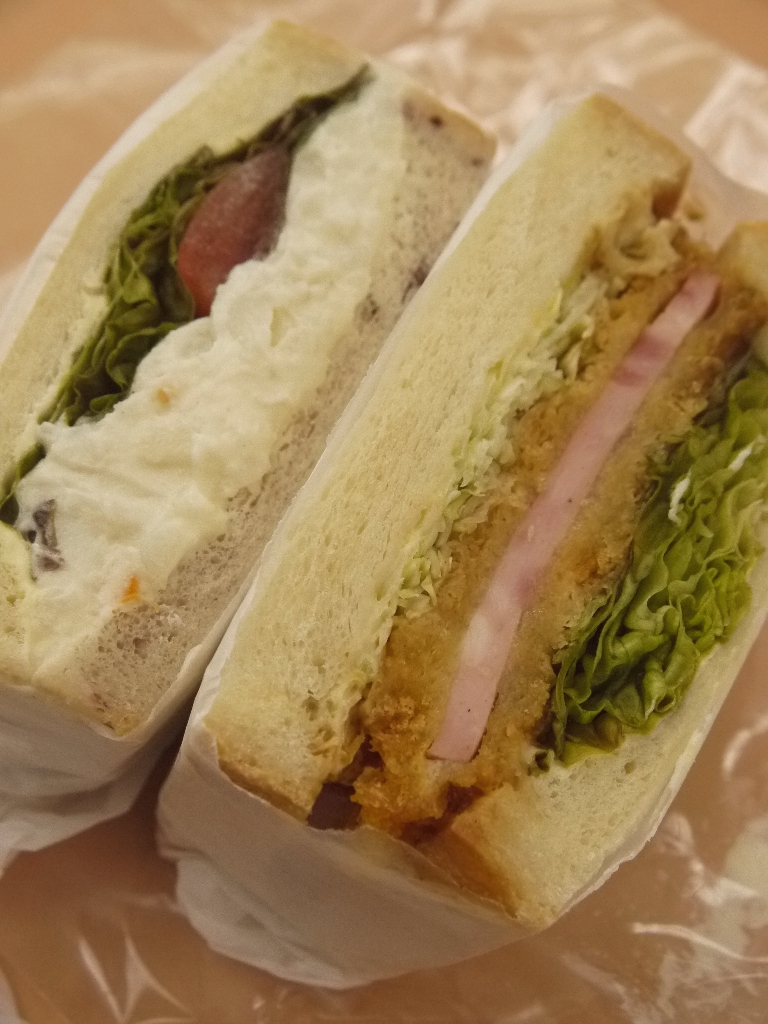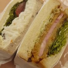 食パンの間に、ハムカツ、レタス、キャベツを挟んでいる。