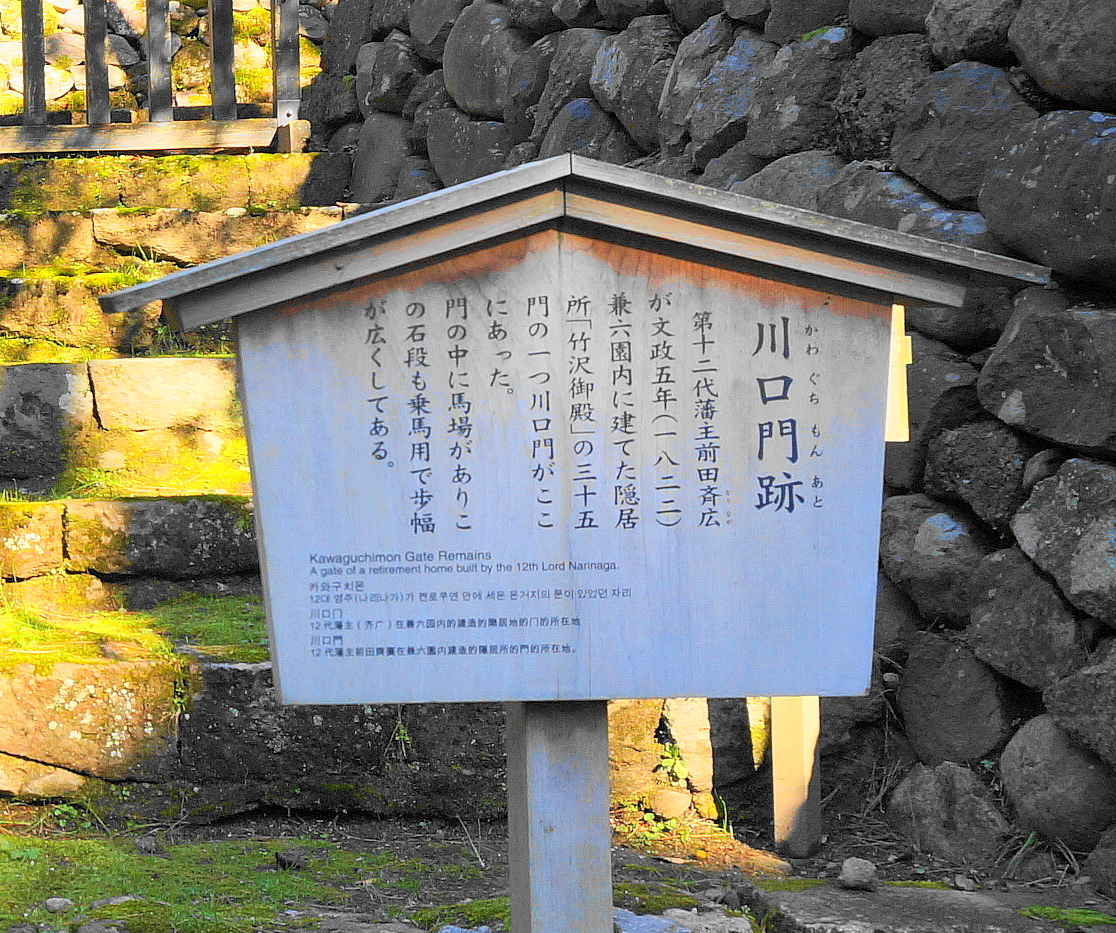 兼六園広坂の途中に、竹沢御殿35門のうち蓮池門とともに残る川口門跡の石段があります。