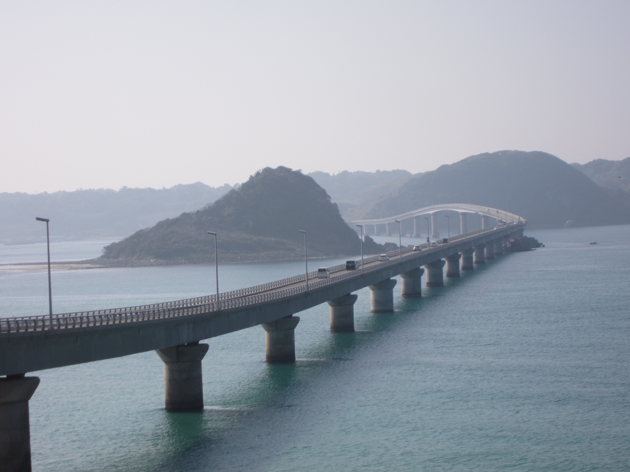 ちょうど晴れの日でした。海の青が透きとおっていて、橋のカーブのデザインがとても美しい眺めです。いよいよ橋を渡って行くと、海がキラキラ輝いて島も見えて絶景でした。高低差があるので、いろいろな角度で景色が楽しめました。