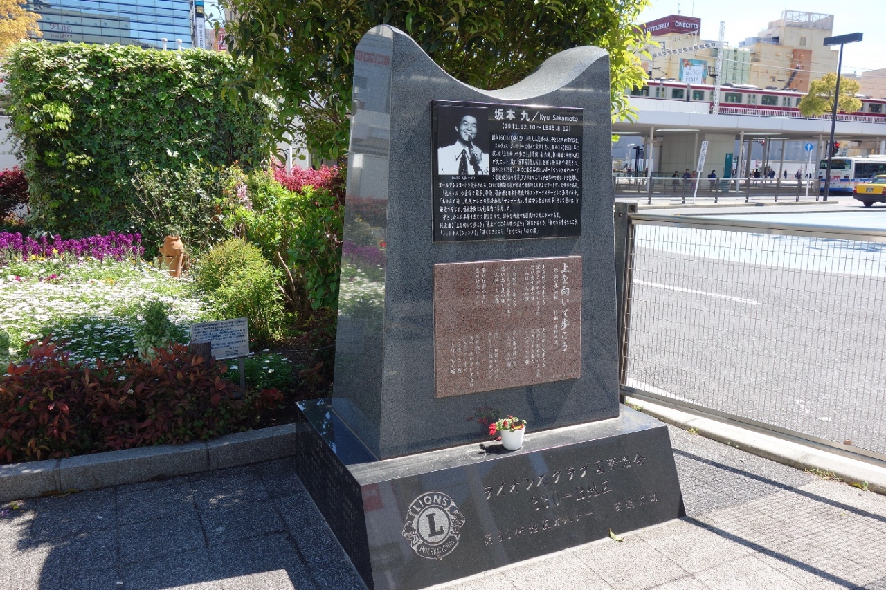 川崎あたりのエリアを散策中こちらの碑を見学しました。JR川崎駅前のバスロータリーの花壇前に立派な石碑が置かれていて目を惹いていました。坂本九氏の功績を讃えた碑には上を向いて歩こうの歌詞も刻まれていました。
