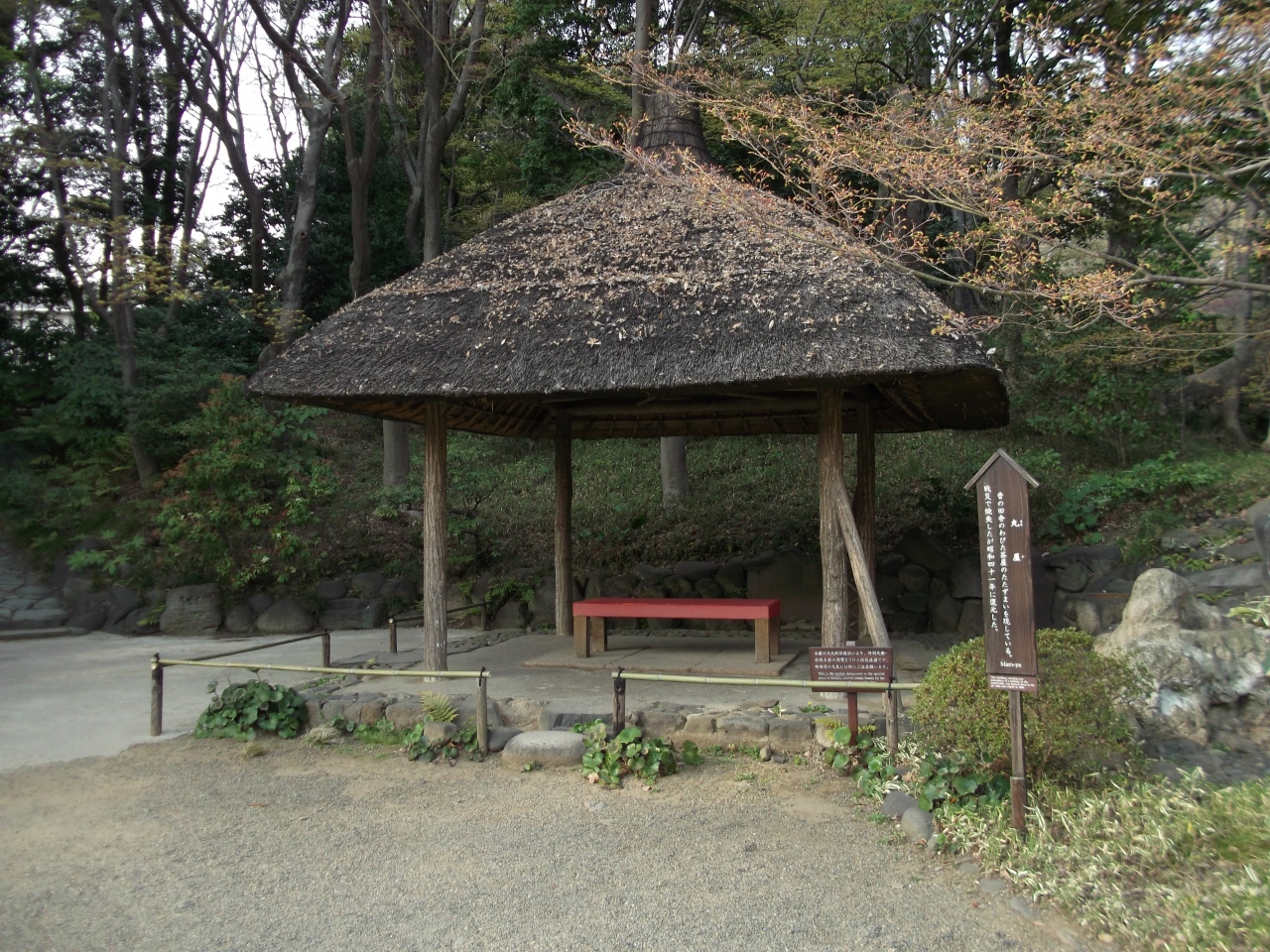 小石川後楽園の入口から、枝垂れ桜、一つ松の前を過ぎた先に茅葺屋根のこの建物があります。昔の茶屋の姿を再現して造られたもので、壁は無く風が中を通り抜けます。今は座る場所もあって、散策途中の休憩所としても使われています。