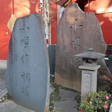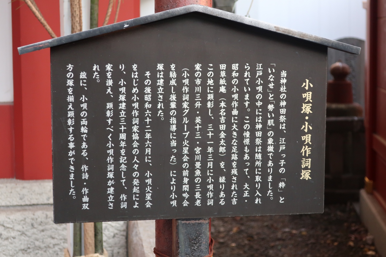 神田明神の御神殿の裏面側、裏参道の途中に小唄塚 小唄作詞塚があります。江戸小唄には神田祭が所々に取り入れられ、小唄の作曲で活躍した吉田草紙庵を称える石碑です。それに併せて小唄作詞の石碑が隣に建てられました。
