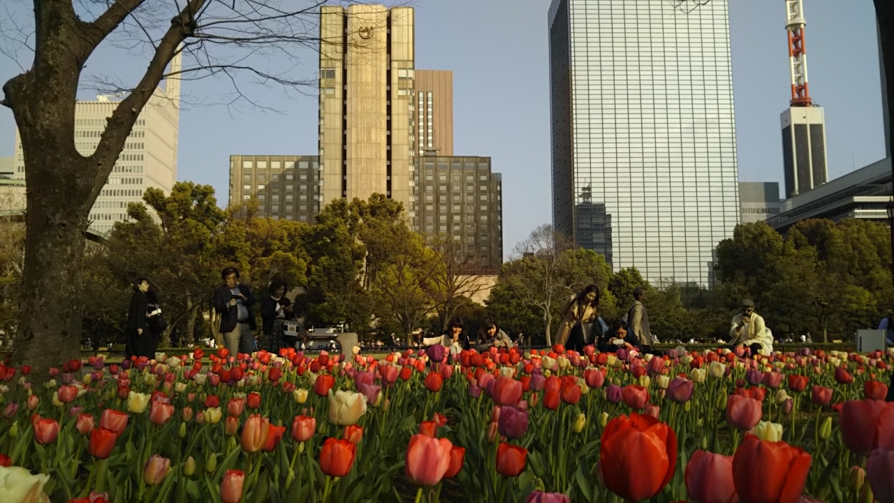 周囲の高層ビル街を背景に、よく手入れされた芝生と、四季を通して植え替えるので花が絶えることがない花壇。春なのでチューリップが満開だ。
