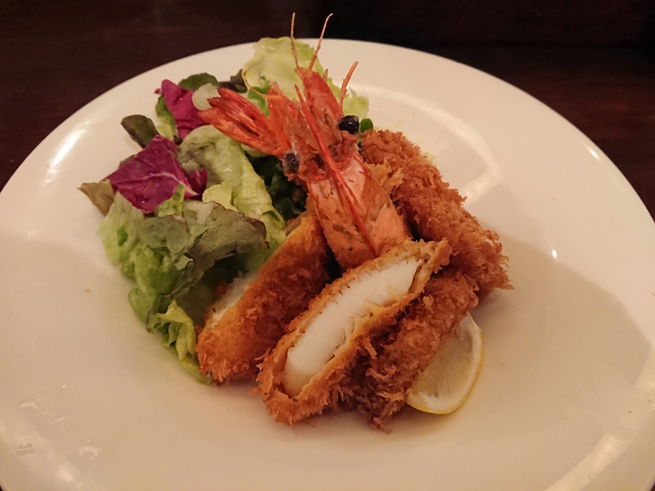 海老、イカ、サーモン、さつまいものフライとサラダがお皿に乗って提供されます。