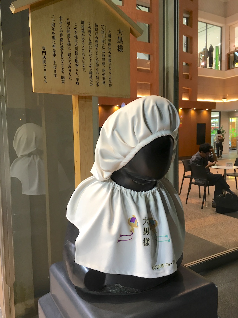 建屋の西側は大国魂神社の参道に面していて、神社に関連した石像が店舗の前に並んでいます。