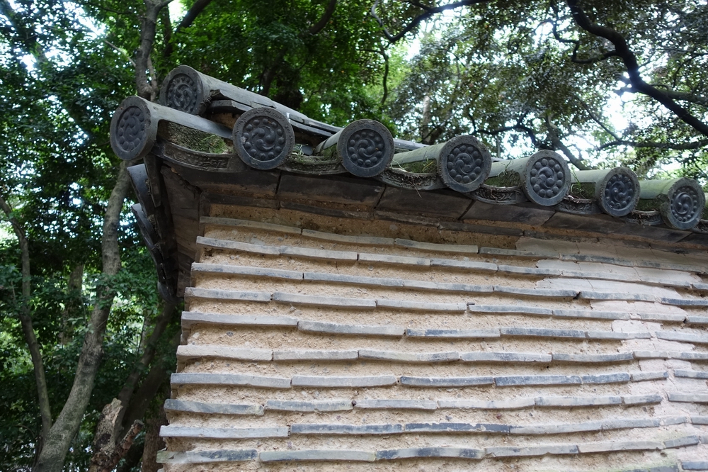 塀は単に土だけで築かれているのではなく、瓦が何層にも間に挟み込まれていて重厚な造り。瓦の横縞模様や下のほうの苔むした感じが風情ありました。戦国時代からの土塀が修繕しながらも状態良く残っているのがすごいと思います。あまり知られていないのか、気に留めて見ている人はわずかでした。