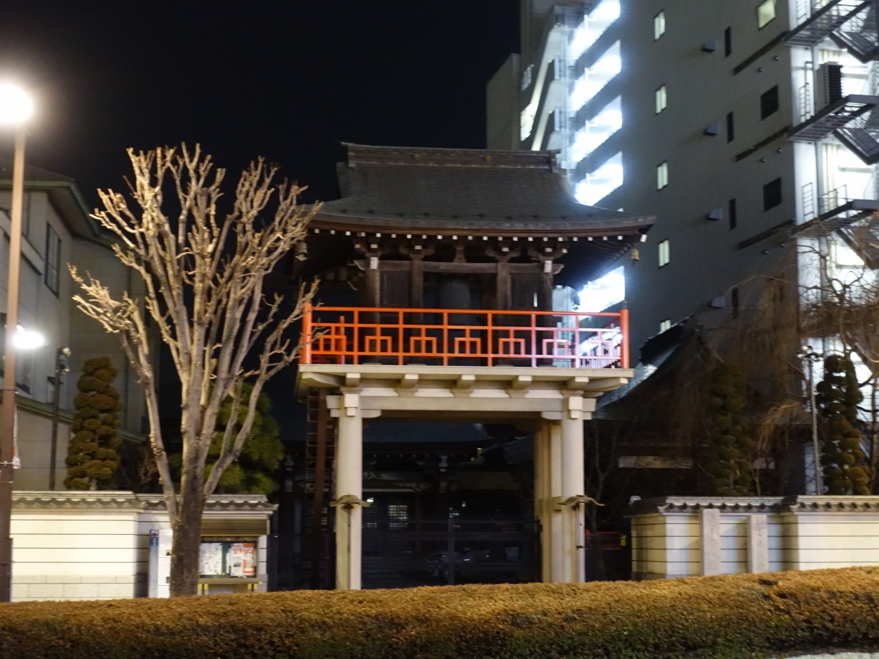 JR宇都宮駅から真西に伸びる大通り沿いに「宝蔵寺」というお寺がありますが、その梵鐘が「およりの鐘」です。鐘楼というと境内の一画にあるという先入観がありますが、こちらは歩道に面しています。夜空に浮かび上がるような姿はとても印象的でした。