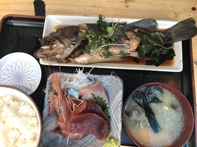 クロソイ一匹ごとの煮つけに、お刺身、あら汁付きとボリュームも満点。