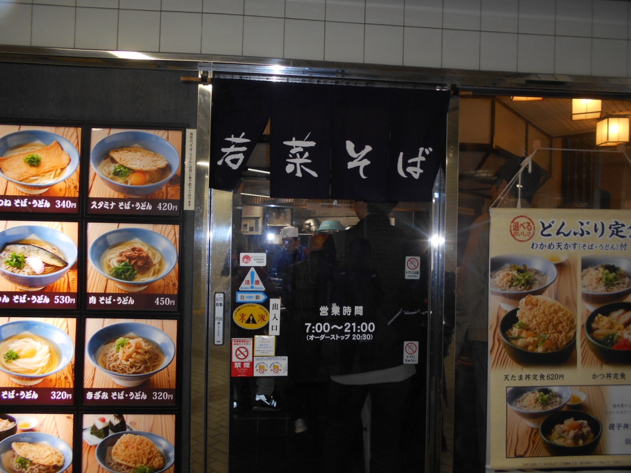 阪急そば若菜 西宮北口店は、阪急西宮北口駅の東南側、すぐのところにあります。階段を降りてすぐです。初めてだと少し場所がわかりにくいかもしれません。