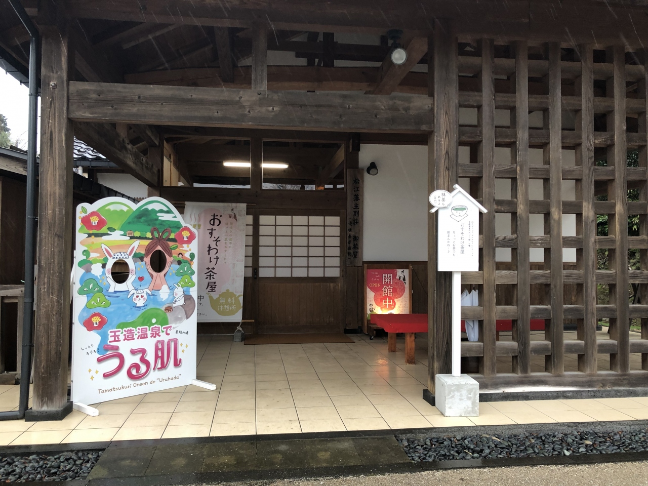 玉造温泉の湯薬師堂のある広場にある休憩所です。中に入ると赤い大きな傘に赤い休憩台という趣のあるセッティング。おじさんとおばさんがいて、おばさんが抹茶を立ててくれました。抹茶とコーヒーは100円です。普通のお茶は無料です。散策の途中で休憩に訪れてみてください。