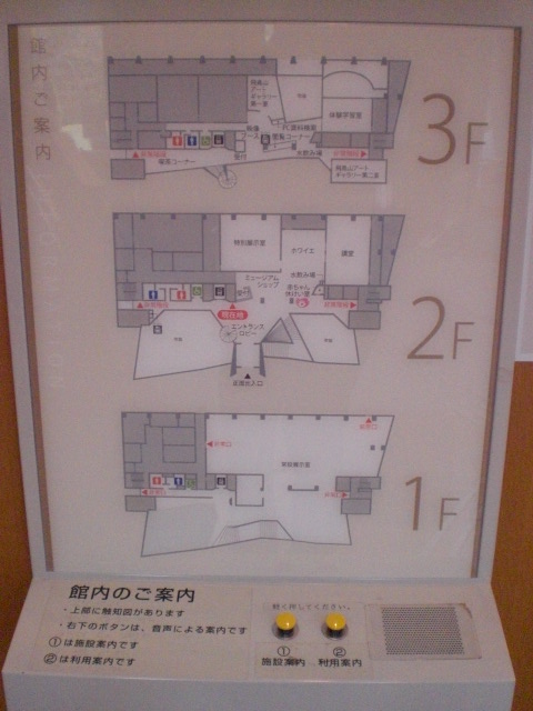 3階建ての建物で、2階が入口と企画展室、3階がギャラリー、1階が常設展示室となっています。