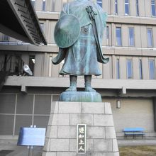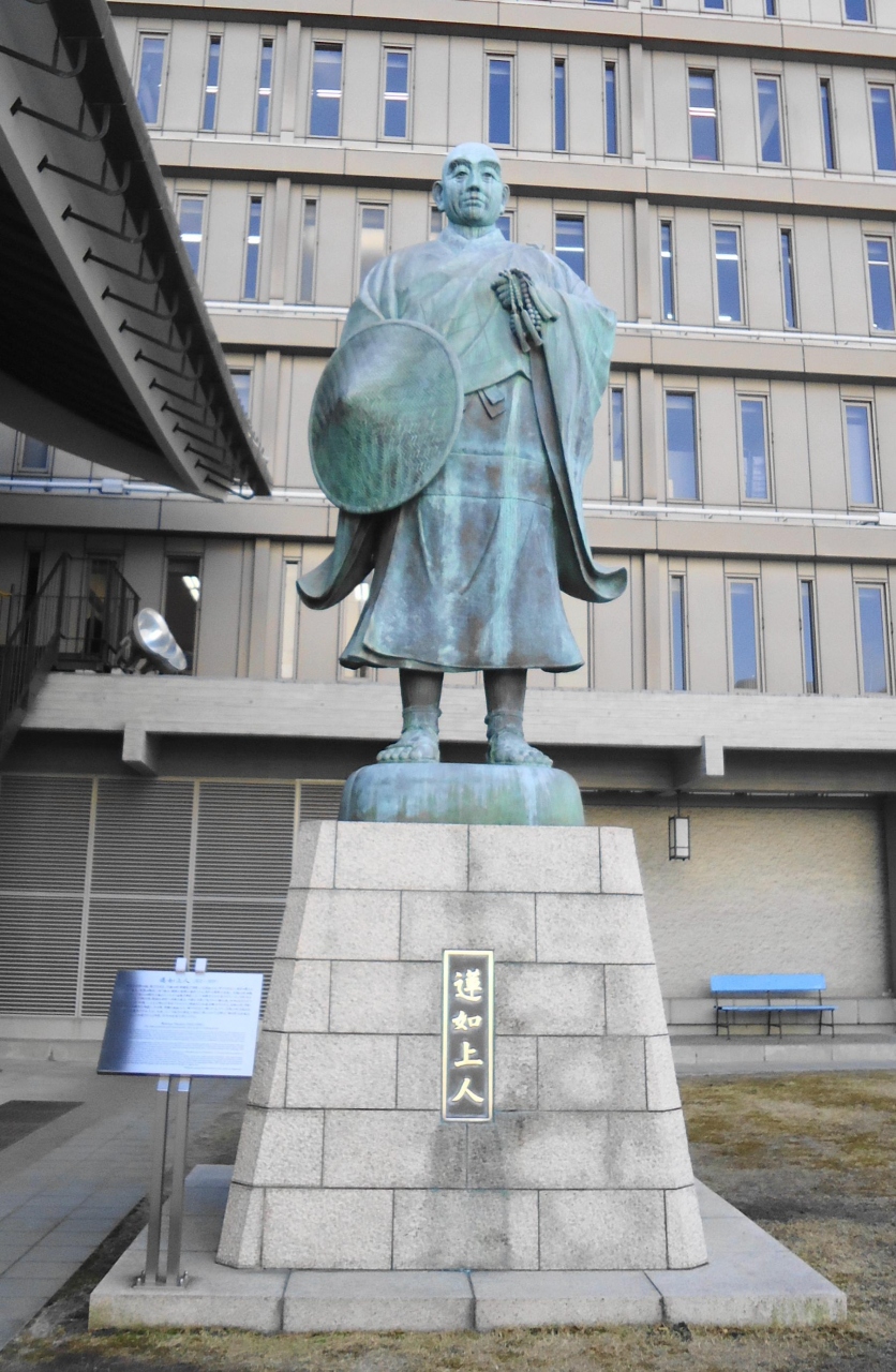 本堂へとつながる石段は圧巻、両脇には親鸞聖人と蓮如上人の像があります。
