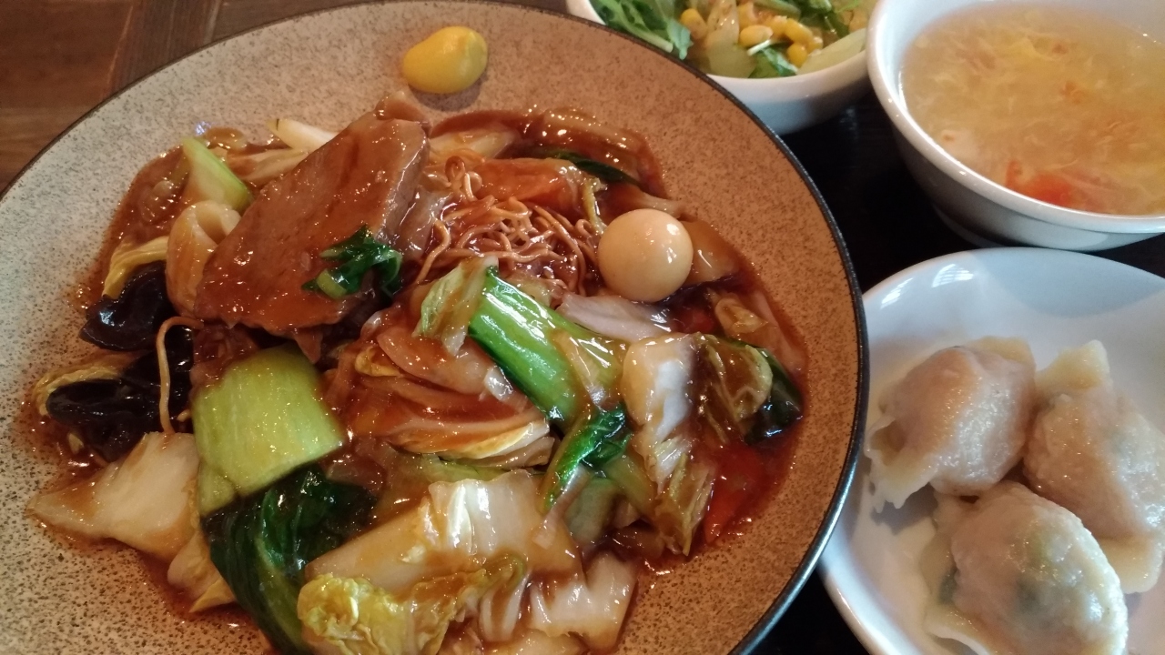 ランチのセットがお得。焼き餃子のセットメニューは1つだが、麺類などのセットは水餃子3個ついているセットがいろいろある。水餃子より焼き餃子のほうがおいしいかなとおもった。あんかけ焼きそばは味が濃い。ランチセットは杏仁豆腐がついていて、これもおいしい