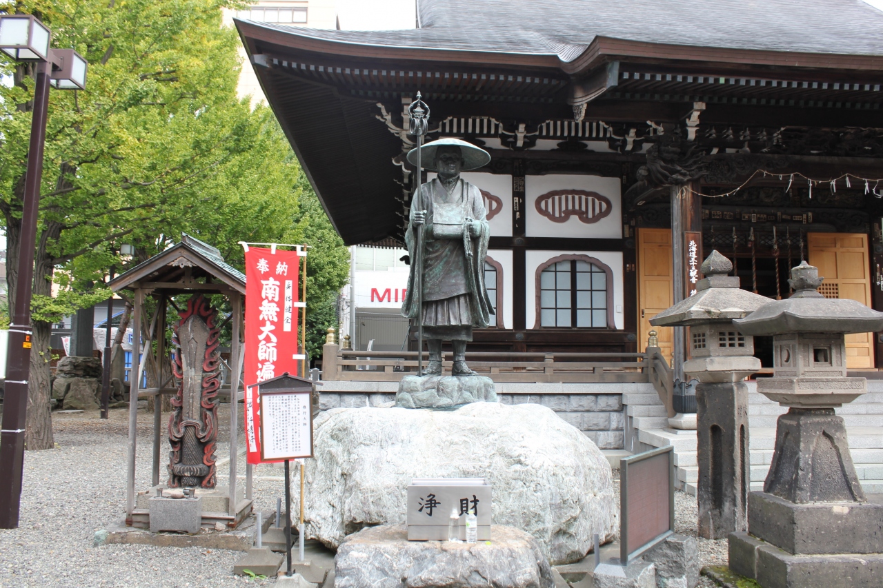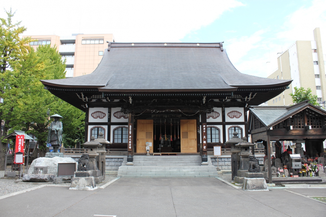 すすきのに近い市街地にありますが境内は意外に広く、本堂、大師堂のほか、屋外に修行大師像、地蔵堂、愛染明王像、平和の鐘など多くの像や記念碑があり、興味深く拝観させて頂きました。