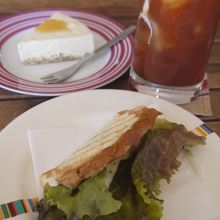 ホットサンドというと、プレスサンドを連想するが、当店のはそうではないらしい。パンにはプレスしたかの様な焼きめが付いていて、中の具は熱々だったものの、閉じられてはおらず、更にレタスを挟んでいた。