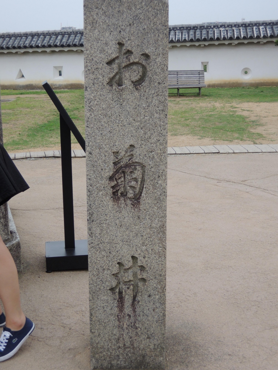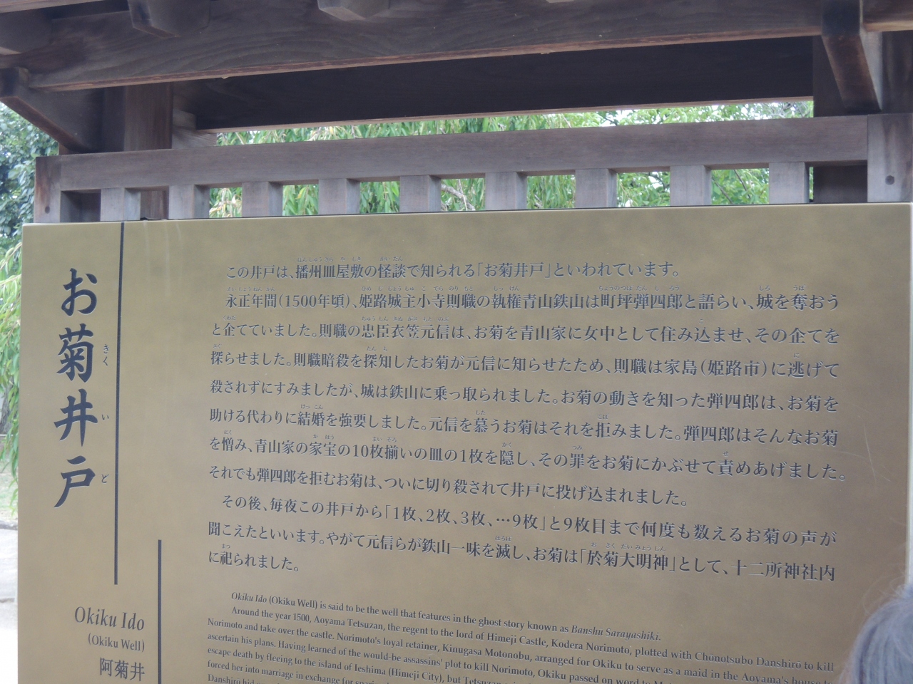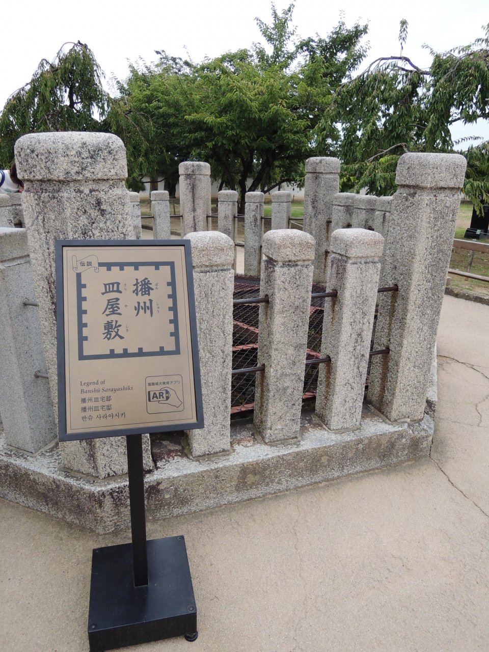 石と網で囲まれ、割と大きな井戸の中には入れないようになっていますが、のぞき込むことはできます。近くには播州皿屋敷の解説板がありますが、実は播州皿屋敷の話しが大正元年に創作された話だったりするので、二の丸にあるこの井戸が本物のお菊さんの井戸ではないんだそうです。