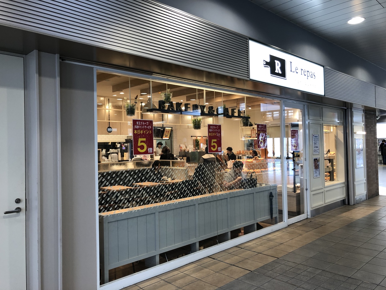 ベーカリーショップですが、コーヒーなどのドリンク類も提供しています。しかもお手頃価格で。店内にはイートインスペースもあり。ということで、今回はコーヒーのみ注文し、カフェとして利用させてもらいました。店内は白を基調とした内装。明るいし、きれいだしで、居心地が良かったです。場所は改札口のすぐ近く。ちなみにイートインはカウンター席の他、テーブル席もありました。