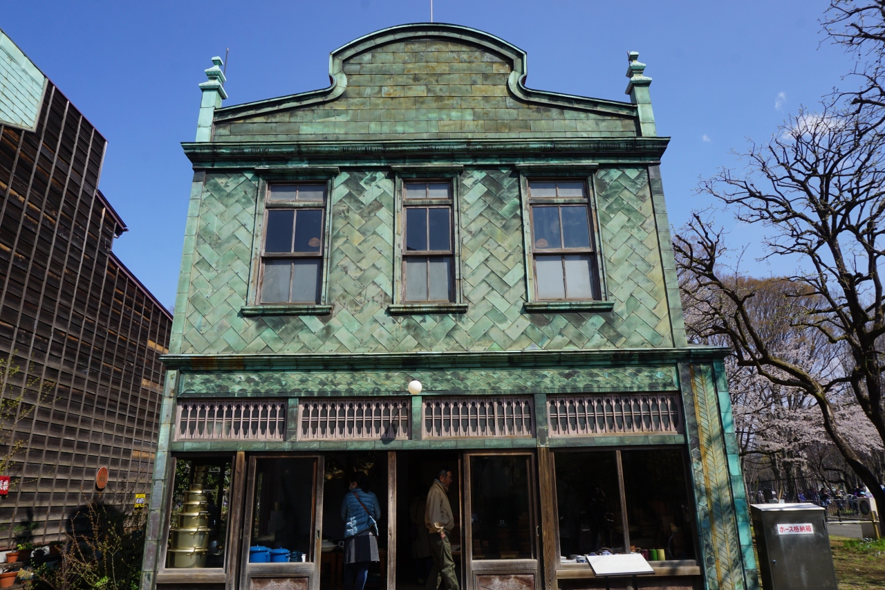 丸二商店は、昭和初期、神田神保町に建てられた荒物屋。前面に銅板を用いた看板建築です。寺院みたいな屋根に三つ並んだ窓。ベースの網代のデザインも、単調にならないように工夫をしたものでしょう。店内はやかんや土鍋に桶などの商品があれこれ。懐かしいような楽しさがありました。