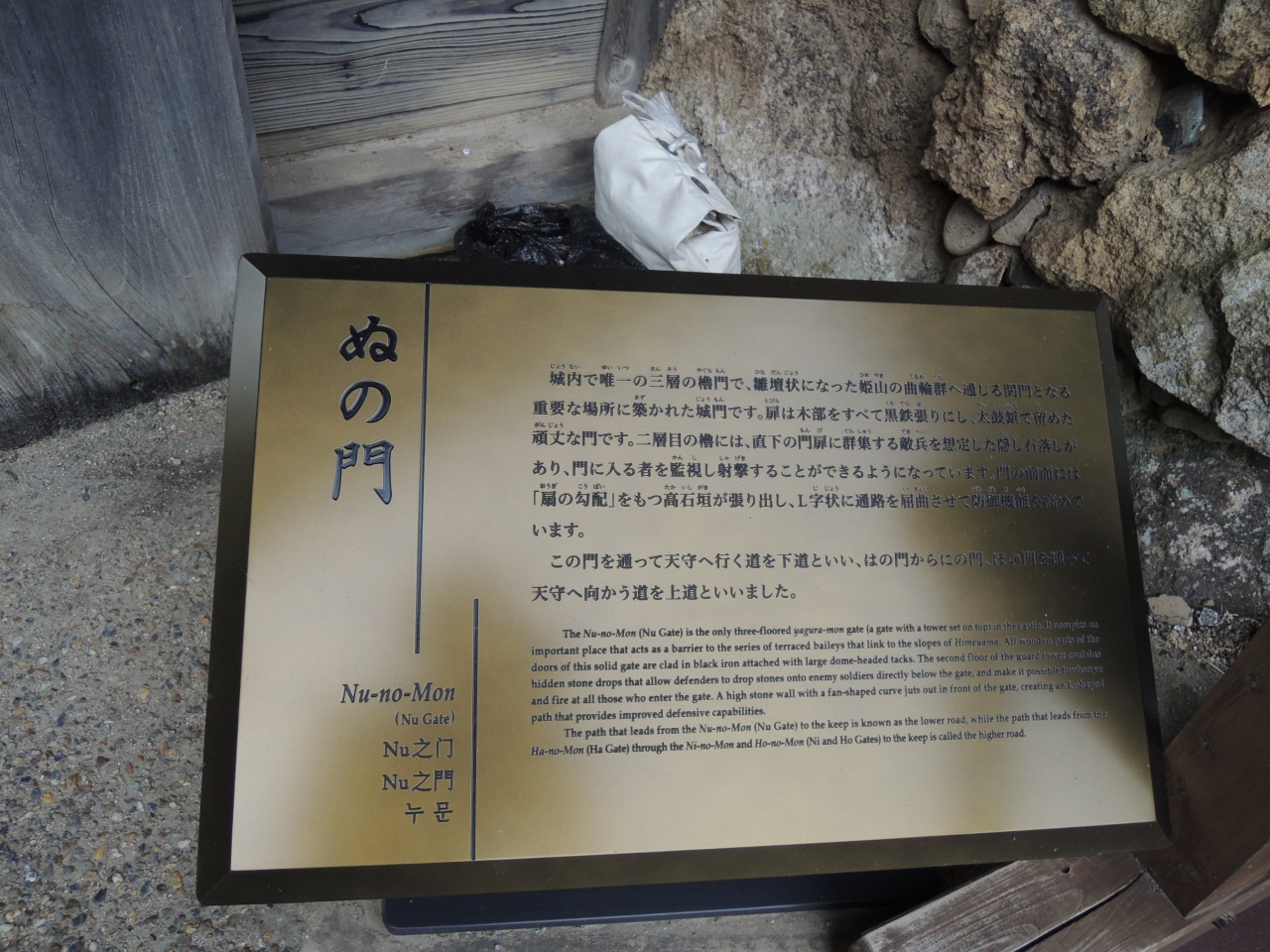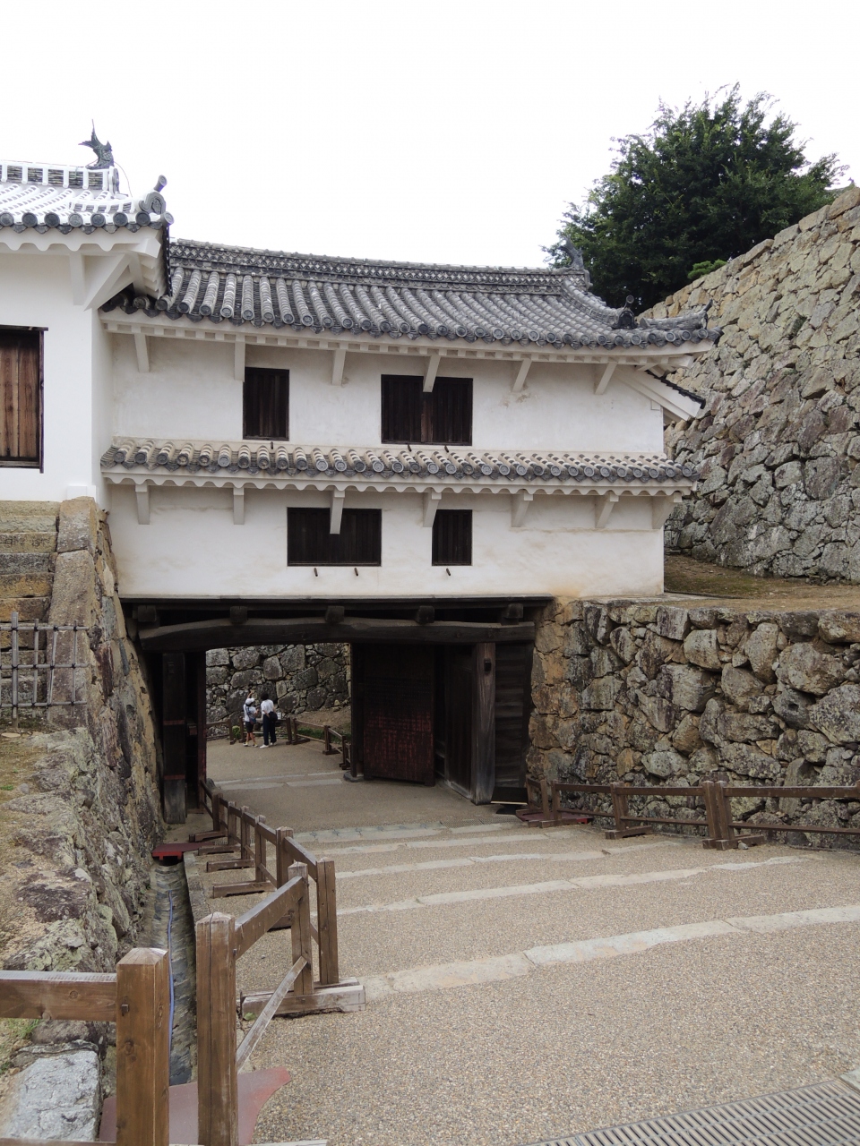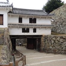 黒塗りの鉄板で扉、柱、冠木がすべて覆われた櫓門です。二層部分には見張り窓があり、本丸への重要な守りを任されている感が漂います。西の防衛の要だった姫路城らしい建物です。備前丸から出るときにある場所なので、見学ルートとしては最後の方にあります。