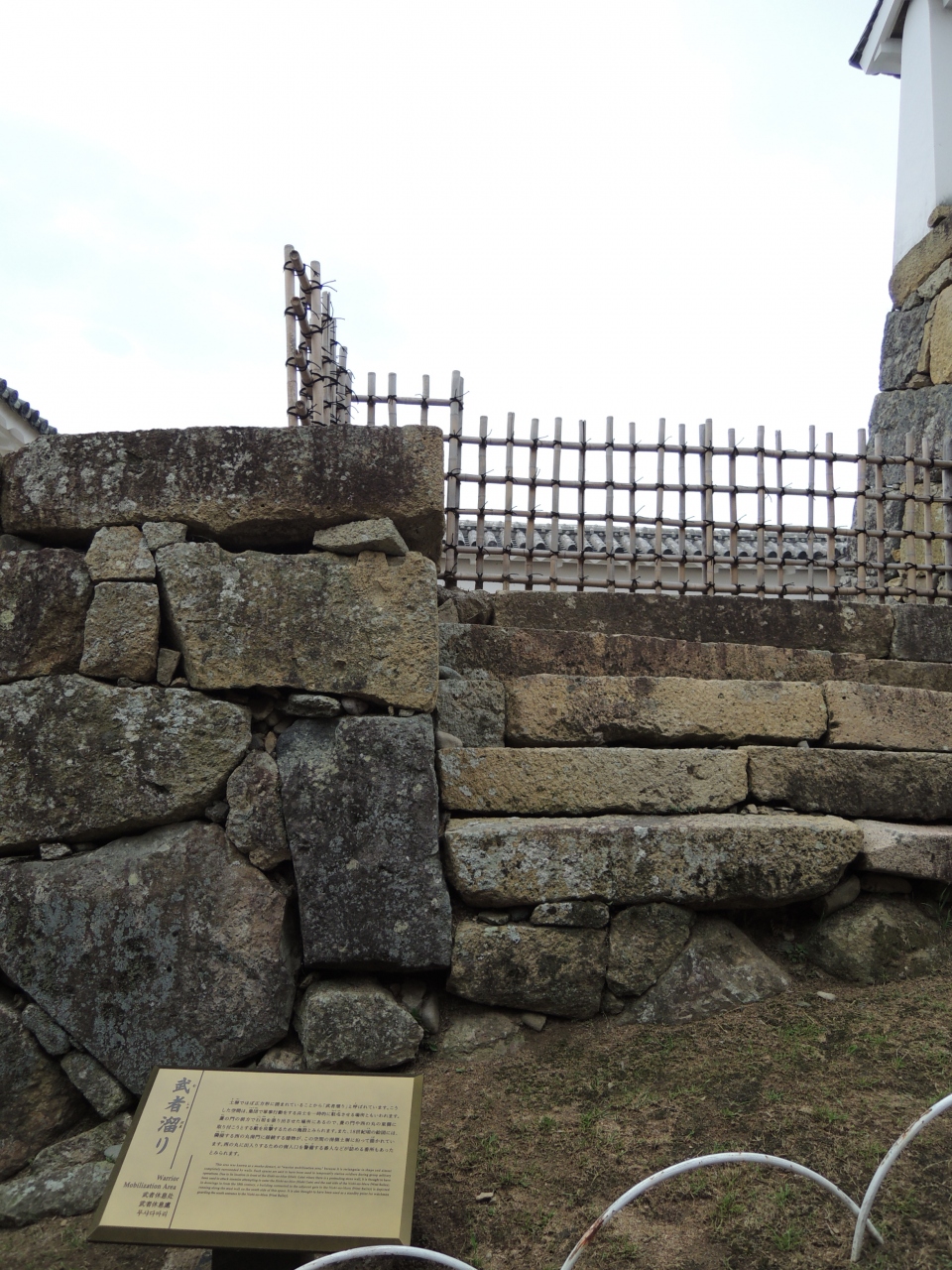 菱の門を通り抜け、西の丸方面へと向かう階段の途中に、石段の上に柵がある場所があります。そちらが武者溜りです。菱の門を見下す場所に、敵を迎え撃つ兵士が集まることができるようにつくられました。さらっと通りすぎてもおかしくない場所ですが、説明板があるので分かると思います。