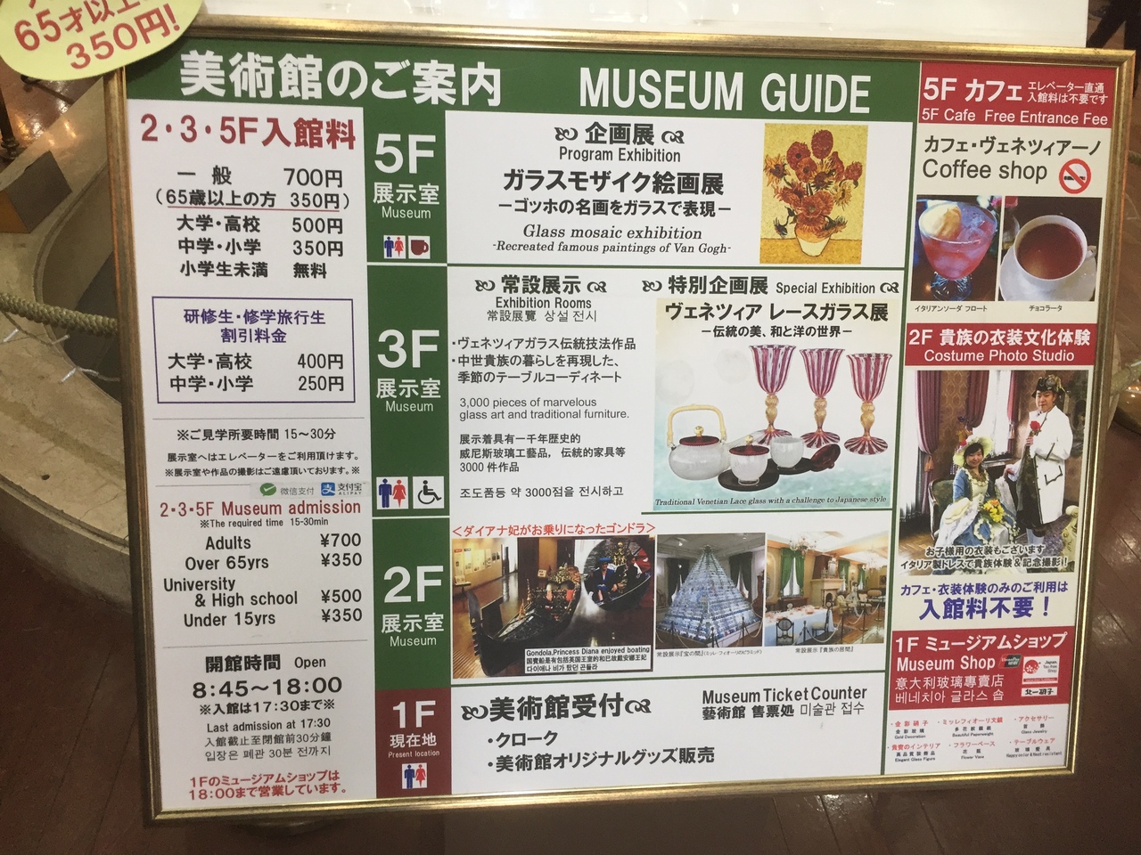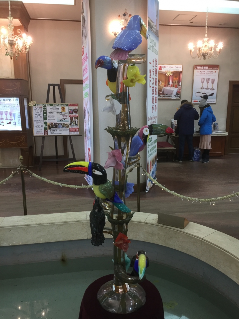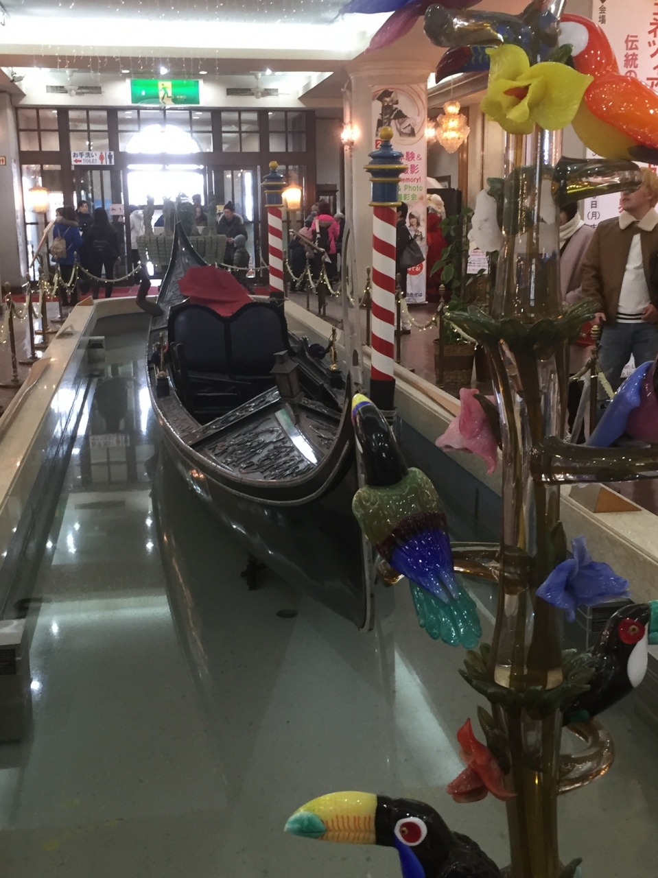 堺町通り商店街にある北一硝子が経営する美術館です。入場料は700円ですが、以前来た時に入ったので、無料のミュージアムショップのみ入りました。店の真ん中にゴンドラが浮かんでいますが、実際に私が乗ったのものより、かなり大きめのサイズでビックリしまさた。