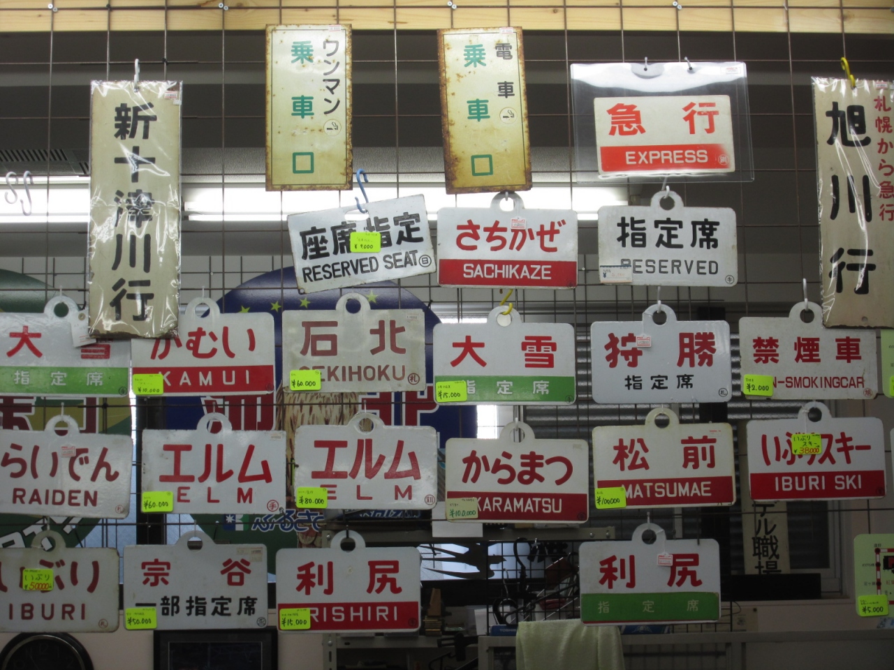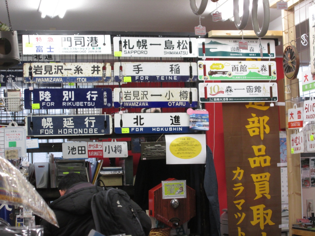 店内には模型、サボ、行先板、切符はじめ鉄道グッズが所狭しと置かれていて、宝探しをするような雰囲気で、鉄道ファンには見ているだけでも楽しいお店です。