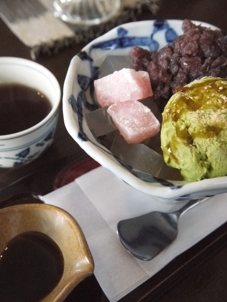 たっぷりの寒天に、自家製の餡と抹茶アイス、そして求肥を乗せ、黒蜜を掛けている。