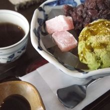 ケーキ等の洋の甘味、あんみつ等の和の甘味、そしてドリンクを提供する。