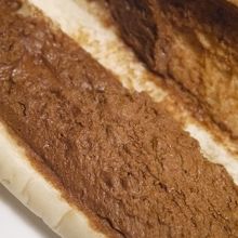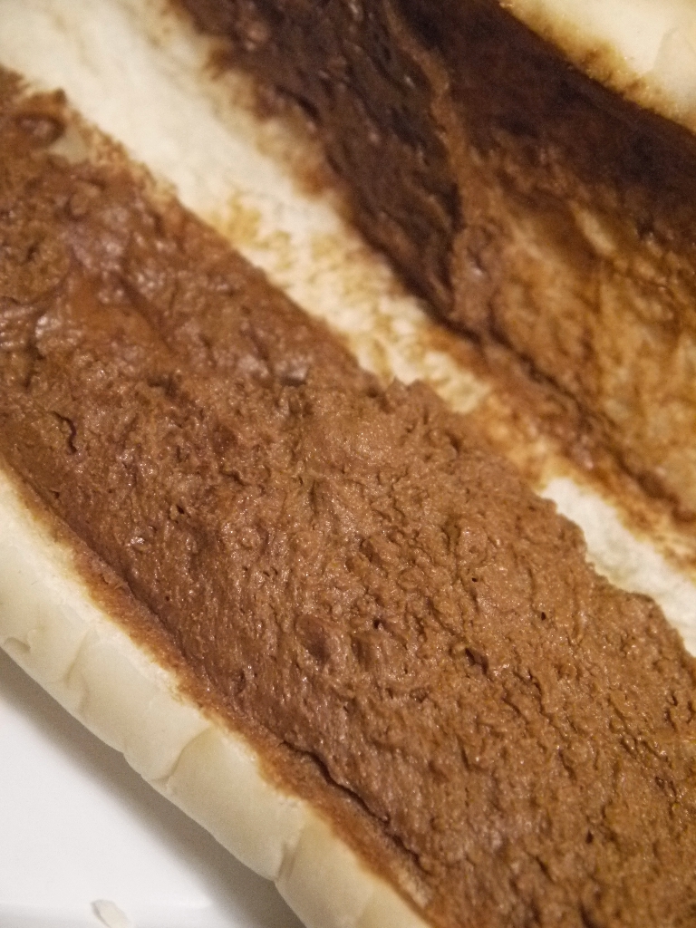 コッペパンに切れ込みを入れ、間にコーヒー風味のクリームをたっぷりと塗っている。