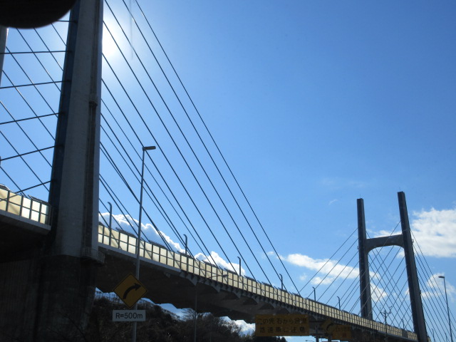 横浜にある大きな橋です。鶴見の大黒ふ頭、本牧ふ頭のところにあって、長さは860メートルだそうです。首都高の湾岸線を利用し、車で通りました。冬のとてもいい天気の日だったので、空の青と橋の橋脚、ロープの様子がきれいでした。