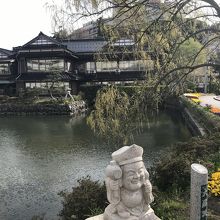 渡月橋のたもとにあって、池の向こうには大正ロマン建築の渡月庵があります。
