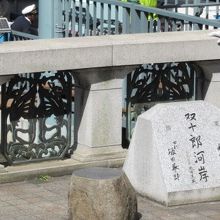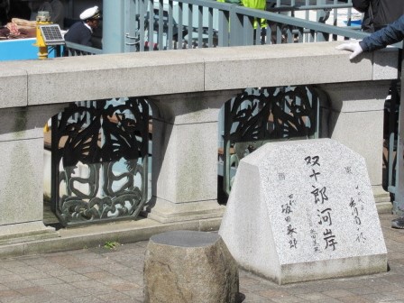 日本橋の南詰東側に「日本橋滝の広場」がありますが、そこにこの「双十郎河岸」の碑はあります。19代目いや20代目とも言われる現在の日本橋は1911年に架けられ2011年には100周年を迎えセレモニーがありました。その時この遊覧船に乗車した歌舞伎役者が坂田藤十郎と市川團十郎でした。そのふたりの十郎からこの船着場を双十郎と呼ぶようになったとのことです。へぇ―江戸時代に繁栄した鮮魚屋さんの双十郎さんじゃなかったのね。(笑)石碑には東・市川団十郎、西・坂田藤十郎と彫られています。納得です。