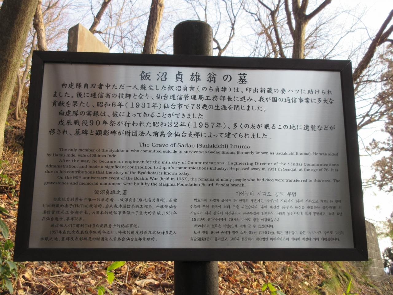 飯盛山、白虎隊の墓のある広場から白虎隊の自刃の地へ行く途中にあります。仙台で生涯を終え、本墓は仙台にあります。当時について多くを語らず、会津若松にも近寄らなかったという。お墓といえばそれまでですが、ただ彼の存在により、白虎隊士についての真実を知ることができたことは、本当に貴重なことだと改めて感じました。