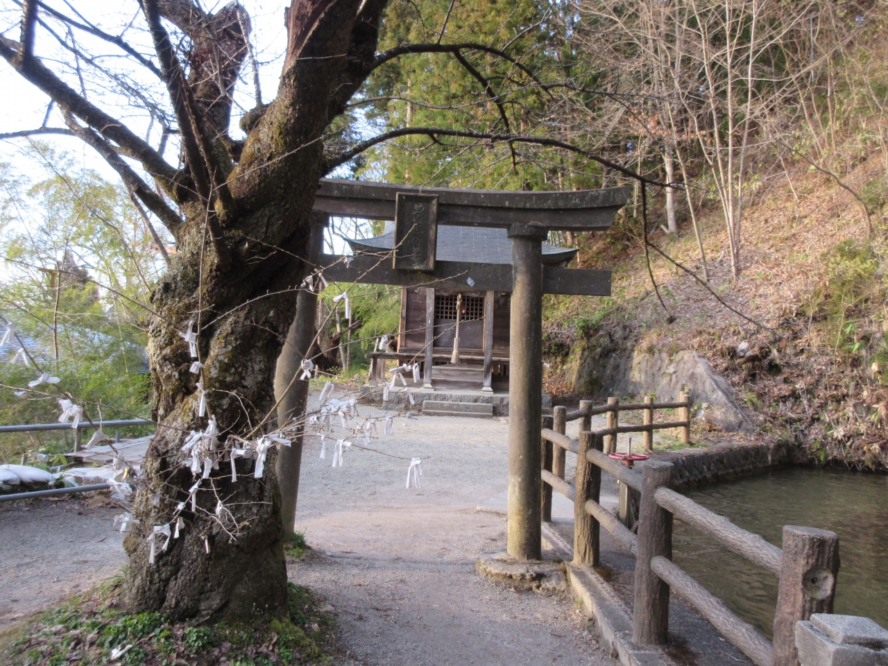 飯盛山の中腹、戸ノ口堰洞穴近くになります。すぐ近くの厳島神社には説明板がありましたが、こちらにはありません。ですが、場所からして堰水を守る守護神だと思います。小さな神社ですが、鳥居手前の大木が印象的でした。