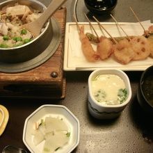 お店は西大路通に面していますが、お店の裏手(西側)に市内にしては広大な駐車場があり、使い勝手が非常に良い。ディナー(17:00~23:00)に家族で利用しました。店内は広くて綺麗でボックス席のようになっていて利用しやすい。“釜飯と串揚げ定食(1590円+税)”を頂きましたが、釜飯は具沢山でとても美味しかった。串揚げは特徴のあるものではなかったが、汁物や茶わん蒸しもついていてボリュームたっぷりで満足しました。
