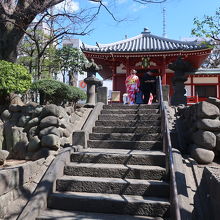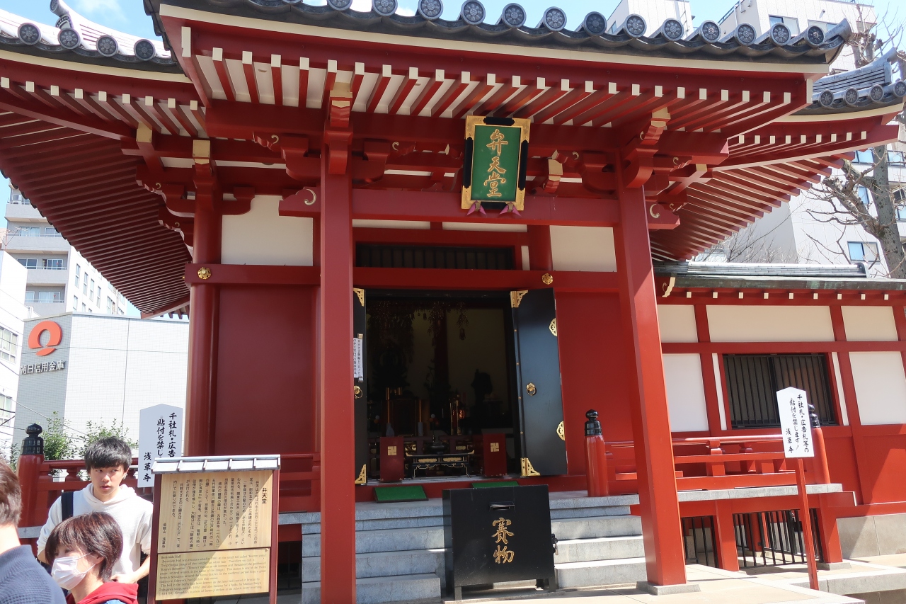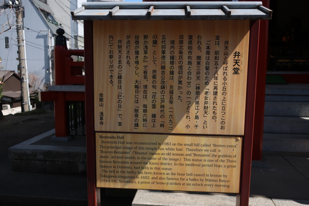 浅草寺の宝蔵門の手前を右手に進んだところに小山があり、そこに弁天様が鎮座する弁天堂があります。老女弁財天を祀っており、関東産大弁天の一つに数えられております。たまたま訪れた日が巳の日だったためお堂の扉がひらかれ弁天様を拝むことができました。