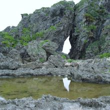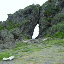 久米島北部の海岸にあり、風と潮の浸食によって出来た奇岩です。波際に建つ巨大な岩に大きな穴が開いていて女性が拝むと子宝に恵まれるというパワースポットだそうです。岩の傍まで行くには、ごつごつした岩場や滑りやすい潮だまり近くを歩く必要があるので、歩きやすい靴が良いです。