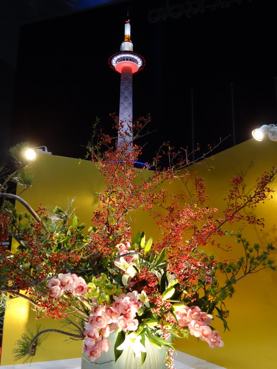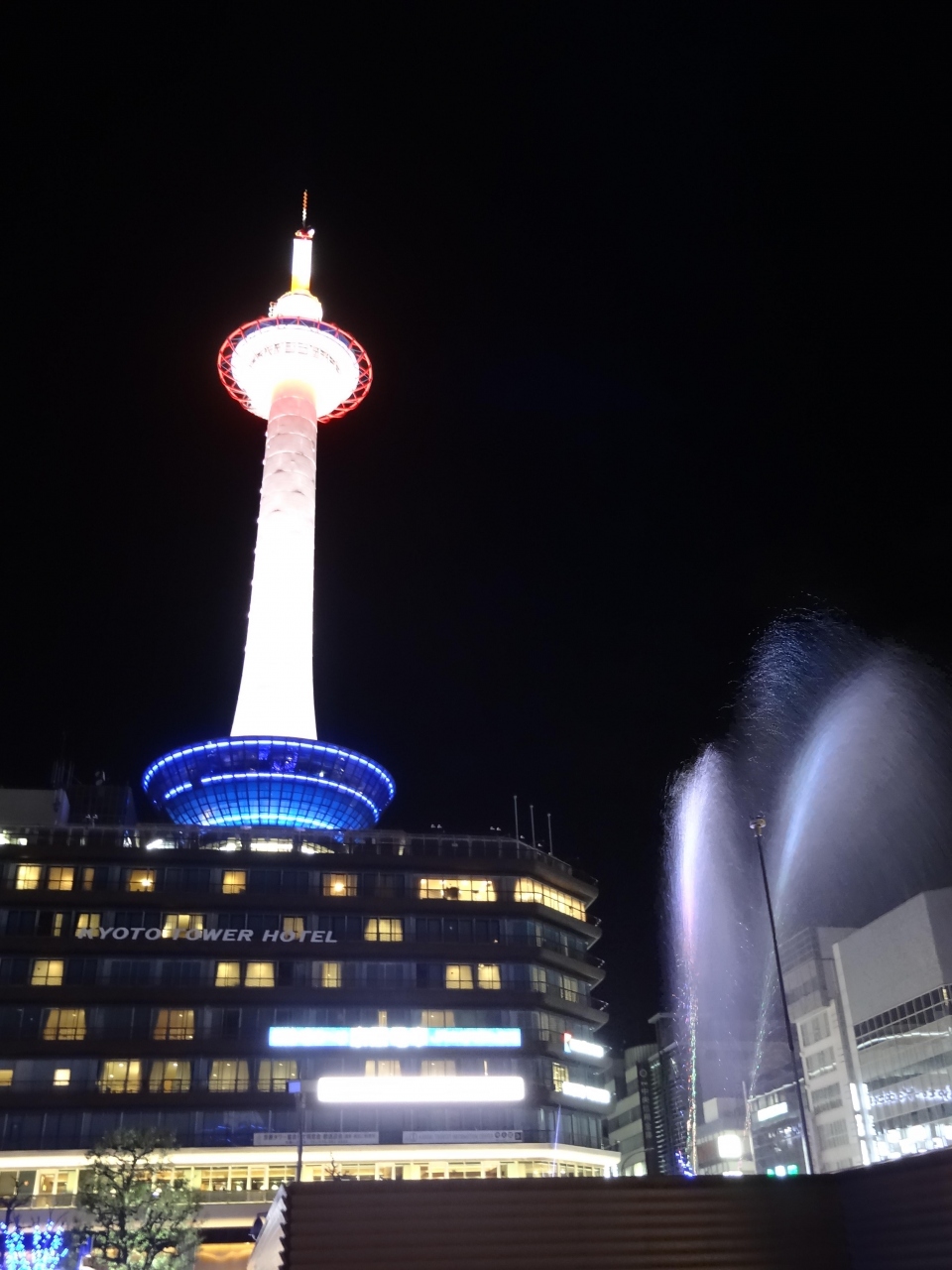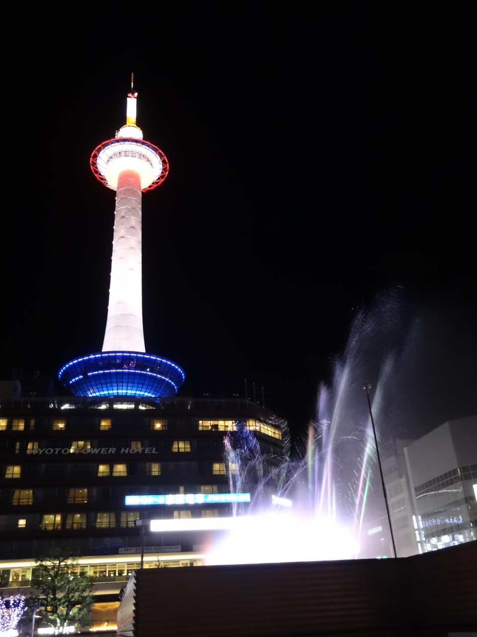 18きっぷ旅の定番となった京都。駅から一番目立つのは京都タワー。今までは、明るいうちに見ていたタワーは、この日は年末、しかも、駅前広場の木々はイルミネーションアップ中。タワーもライトアップされてピンクやオレンジ色に染まっています。広場にある噴水からシャワーが上がると同時に華やかな音楽が流れてきます。音楽に合わせて噴水のシャワーが踊ります。それに合わせるかのように、ライトアップされたタワーが一緒に戯れているかのよう。素晴らしい景色でした。Aqua Fantasyが終わっても、駅構内では生け花の展示がされていて、豪華な生け花を遠景にタワーを置いて撮影。華やかな写真が撮れて満足しました。