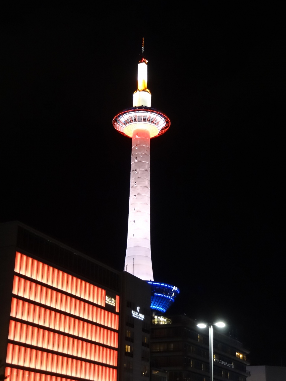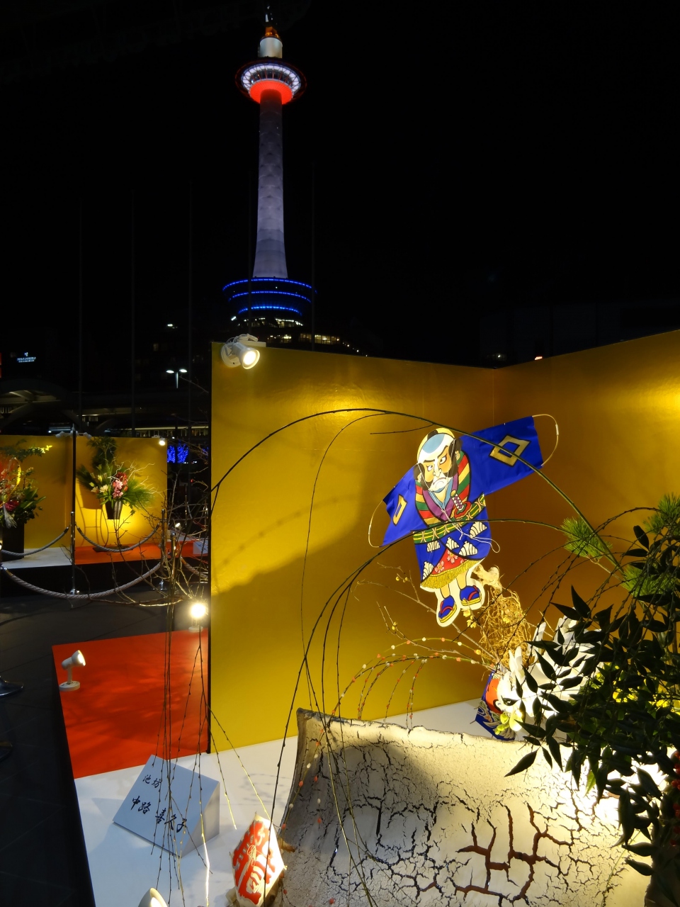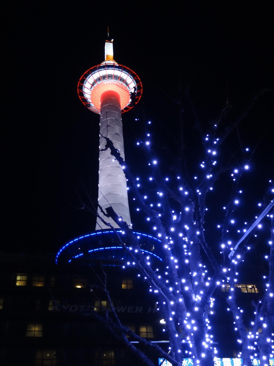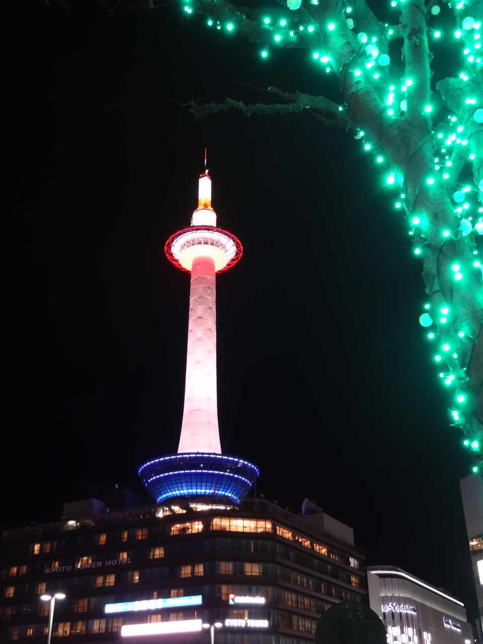 18きっぷ旅の定番となった京都。駅から一番目立つのは京都タワー。今までは、明るいうちに見ていたタワーは、この日は年末、しかも、駅前広場の木々はイルミネーションアップ中。タワーもライトアップされてピンクやオレンジ色に染まっています。広場にある噴水からシャワーが上がると同時に華やかな音楽が流れてきます。音楽に合わせて噴水のシャワーが踊ります。それに合わせるかのように、ライトアップされたタワーが一緒に戯れているかのよう。素晴らしい景色でした。Aqua Fantasyが終わっても、駅構内では生け花の展示がされていて、豪華な生け花を遠景にタワーを置いて撮影。華やかな写真が撮れて満足しました。