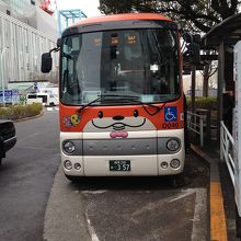 犬の顔が可愛い、オレンジ色の小さいバスですね。