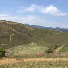 リフトで標高500メートルの頂上に着くと中央に火口があるが今は草に覆われたアーチェリー場になっている。火口の周り1キロは徒歩で20分ほどだとのことで歩いてみる。