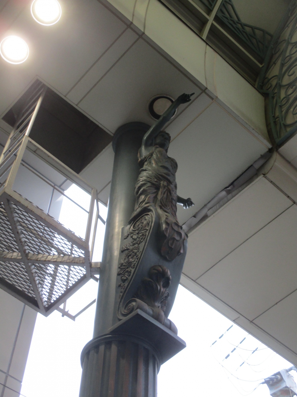 元町商店街に女神の像があるということで、これは見たいと思いましたがありません。そこで、神戸街づくり会館のスタッフに聞くと、「そこにありますよ」と言われ、上を見ると、柱の上部に付いてました。こっそり棲息する小柄の女神様でした。