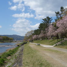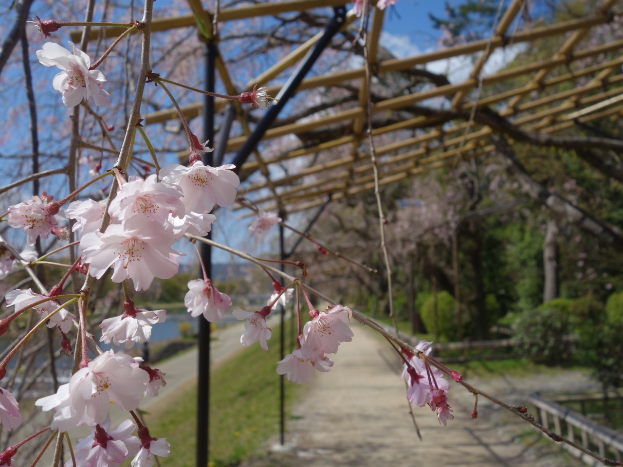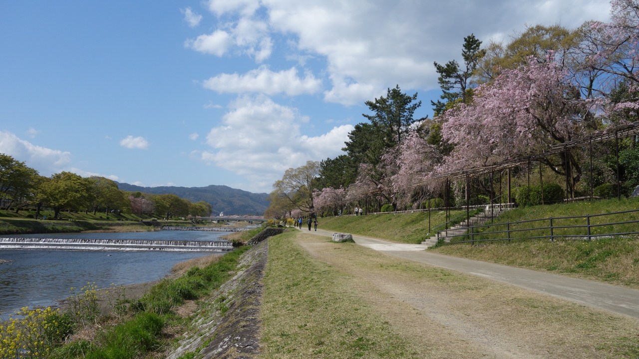 植物園のおとなり,賀茂川の堤防沿いの道です。枝垂桜がきれいに咲いています。管理もされていて,とてもきれいです。賀茂川沿いにお散歩しながら鑑賞できます。オススメのところです。植物園に来たついでにぜひどうぞ。