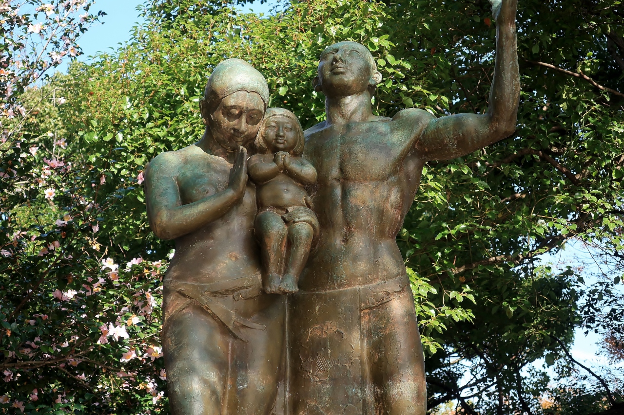 平和のイメージは母子や家族なのだろう。平和資料館の前にある「嵐の中の母子像」やこの像の近くにある「平和祈念碑」はいずれも母子の像だ。そして、祈りの像は幼子を抱いた若い夫婦が三人で祈りをささげる姿を表現している。夫は天を仰ぎ、子供は両手を合わせ、妻は片手で「合掌」する。また、この場所には複数の像があるが、原爆死没者慰霊碑を見守るような位置だ。
