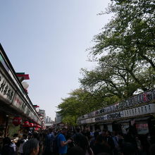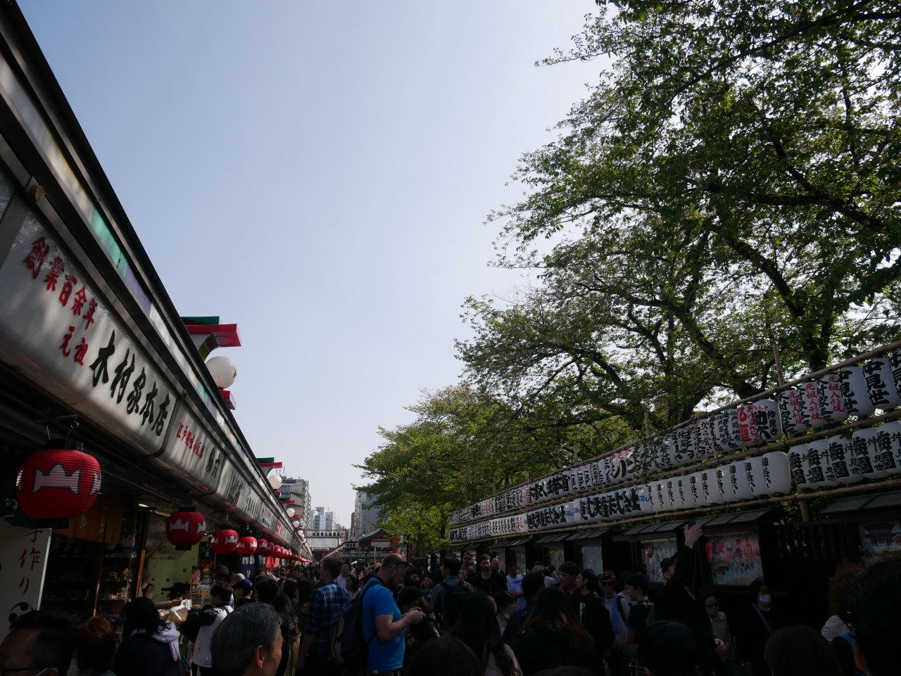 浅草寺の雷門から本堂に向かう通り、幅2~3メートルの狭い通りの両側にお店が連なり、名物の人形焼きやお饅頭などのお店や玩具店が並んでおり、多くの人でにぎわっていました。食べ歩きにぴったりなお店も多くありましたが、とても混んでいたので実際に食べ歩きするのは難しそうでした。
