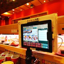 注文は、タッチパネルで頼みます。写真に値段がついているので、外国からのお客様にも分かりやすいんじゃないかな。さらに、タッチパネルの上にレールがあり、頼んだお寿司は「新幹線」に乗って運ばれてきます(笑)