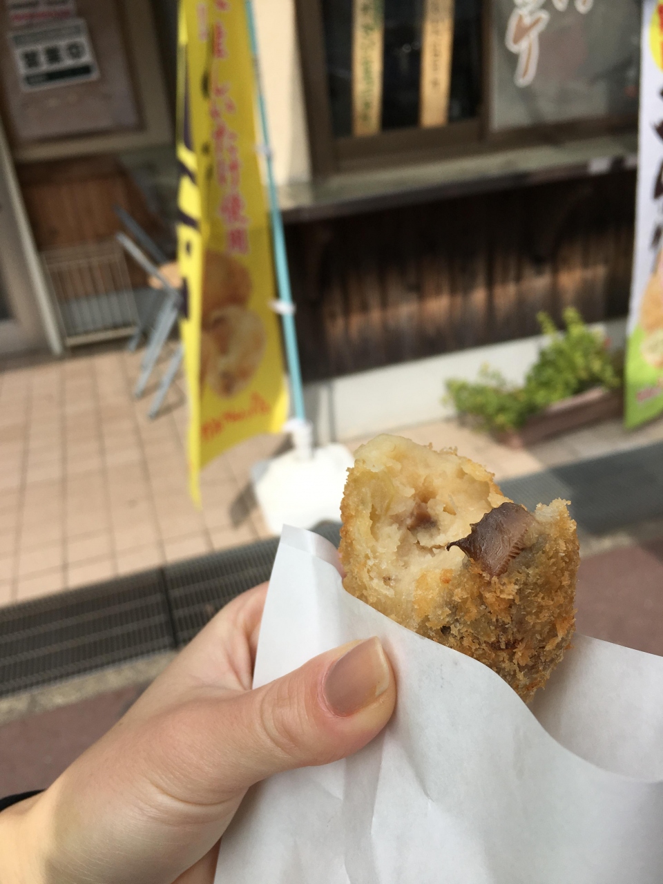 道の駅の天城越えに立ち寄った際に、こちらのお店でコロッケを購入しました。コロッケはワサビ味としいたけ味があります。相方がシイタケが大好きなので、しいたけコロッケを購入。しいたけがごろりと中に入っていて美味しく食べていました。店内には、ちょっとした野菜なども売られていました。